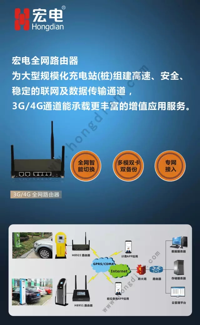 對(duì)于大型規(guī)模化充電樁(站),采用宏電全網(wǎng)路由器,可以組建高速、安全、穩(wěn)定的聯(lián)網(wǎng)及數(shù)據(jù)傳輸通道,3G/4G通道能夠承載更豐富的增值應(yīng)用服務(wù)。