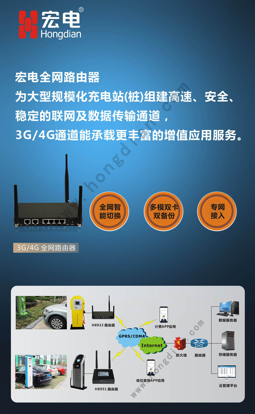 對于大型規(guī)模化充電樁(站),采用宏電全網(wǎng)路由器,可以組建高速、安全、穩(wěn)定的聯(lián)網(wǎng)及數(shù)據(jù)傳輸通道,3G/4G通道能夠承載更豐富的增值應用服務。