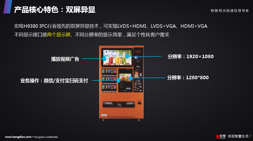 擁有行業(yè)領(lǐng)航的雙屏異顯技術(shù),可實(shí)現(xiàn)LVDS+HDMI、LVDS+VGA、HDMI+VGA不同顯示屏接口接兩個(gè)顯示屏、不同分辨率的顯示效果,可同時(shí)滿足業(yè)務(wù)操作和媒體廣告投放需求 。