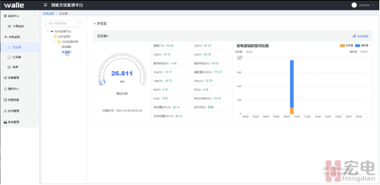 發(fā)電監(jiān)測:對電站重點設(shè)備如匯流箱、逆變器、電表,以及所處的環(huán)境狀態(tài)、設(shè)備運行狀態(tài)進行實時監(jiān)控并有效地統(tǒng)計運行數(shù)據(jù),通過發(fā)電量輻射量柱狀圖實現(xiàn)損耗分析、系統(tǒng)效率分析,智能輔助生產(chǎn)運行。