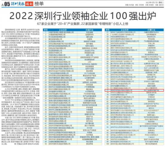 今日,由深圳市行業(yè)領(lǐng)袖企業(yè)發(fā)展促進(jìn)會(huì)、深圳商報(bào)與讀創(chuàng)客戶端共同主辦的“2022深圳行業(yè)領(lǐng)袖企業(yè)100強(qiáng)”評(píng)選結(jié)果出爐,宏電股份憑借在5G工業(yè)通訊終端產(chǎn)品領(lǐng)域的卓越成就,成功入選。