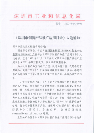 近日,深圳市工業(yè)和信息化局公布《深圳市創(chuàng)新產(chǎn)品推廣應(yīng)用目錄(2022年第三批)》,經(jīng)深圳市工信部門組織專家評(píng)審一致認(rèn)可,宏電股份申報(bào)的智能采集器、智能水位監(jiān)測(cè)站憑借核心技術(shù)力強(qiáng)和市場(chǎng)推廣效果好等突出優(yōu)勢(shì)成功入選,并成為政府機(jī)構(gòu)采購(gòu)?fù)扑]產(chǎn)品。