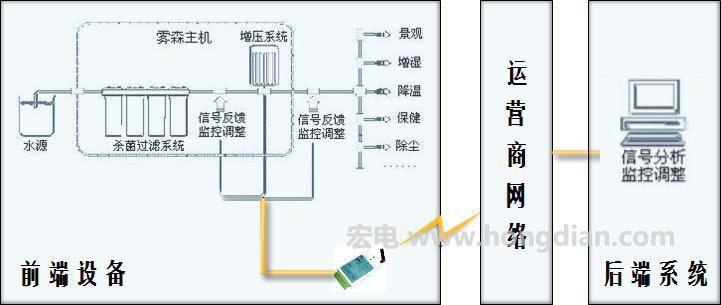宏電無線自動霧森系統(tǒng)是一種基于移動數(shù)據(jù)傳輸平臺的自動感應(yīng)、自動控制應(yīng)用,在固定或移動霧森主機(jī)內(nèi)置無線數(shù)據(jù)終端,以無線自動霧森系統(tǒng)為管理平臺,移動通信數(shù)據(jù)網(wǎng)絡(luò)為傳輸通道,實時或定時對前端霧森主機(jī)進(jìn)行控制,從而減少浪費(fèi),提高效率。