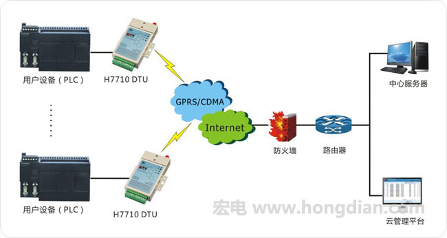 本方案中整個(gè)系統(tǒng)由用戶設(shè)備、宏電無(wú)線數(shù)據(jù)傳輸設(shè)備(DTU)、服務(wù)器三大主要部分組成,如下圖所示。服務(wù)器通過(guò)Internet網(wǎng)絡(luò)、GPRS/CDMA網(wǎng)絡(luò)與無(wú)線數(shù)據(jù)傳輸設(shè)備(DTU)建立連接,無(wú)線數(shù)據(jù)傳輸設(shè)備(DTU)又通過(guò)串口(RS-232/485/422)直接與位于各個(gè)工業(yè)現(xiàn)場(chǎng)的PLC相接,以實(shí)現(xiàn)對(duì)PLC遠(yuǎn)程控制。