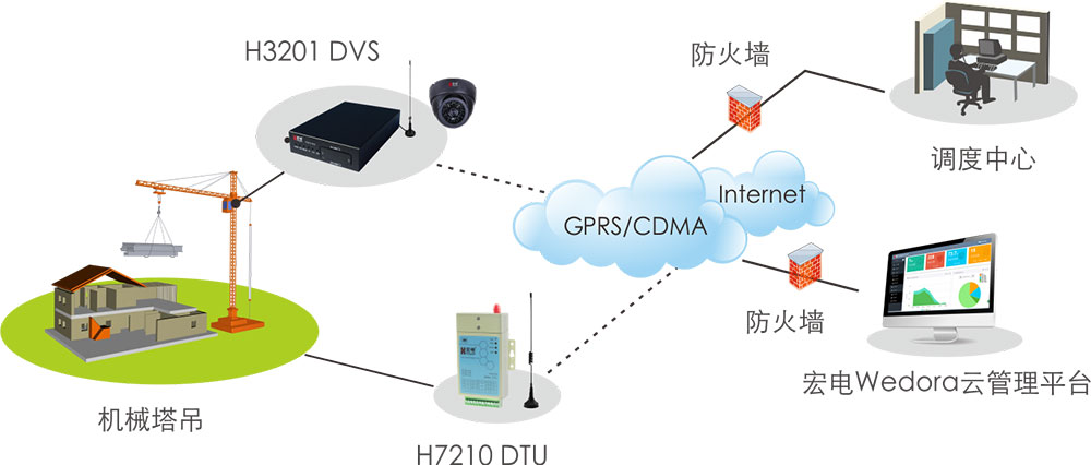 本方案應(yīng)用宏電低功耗GPRS無線通信DTU H7710,擔(dān)當(dāng)塔吊機(jī)無線組網(wǎng)與數(shù)據(jù)傳輸。通過GPRS/CDMA/WCDMA/EDGE/EVDO/TD-SCDMA等無線網(wǎng)絡(luò)接入Internet,并與系統(tǒng)控制中心的服務(wù)器建立連接,為塔吊現(xiàn)場數(shù)據(jù)、遠(yuǎn)程監(jiān)控中心發(fā)布的控制命令等數(shù)據(jù)建設(shè)透明的傳輸通道。