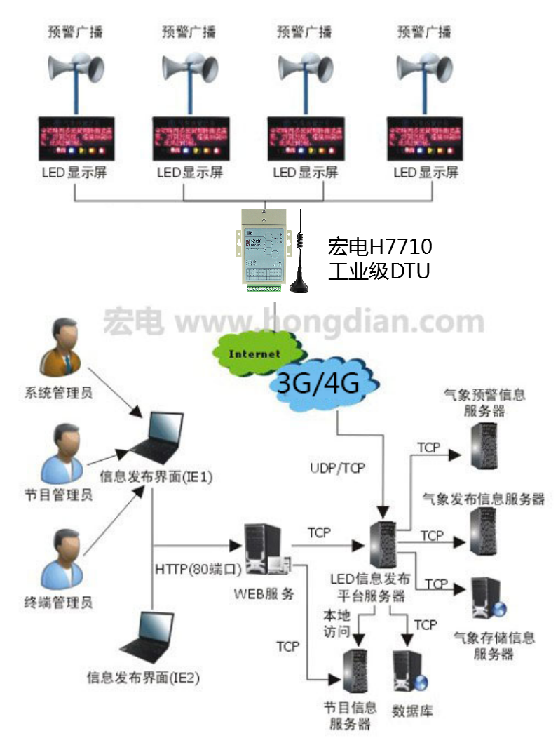2)傳輸網絡:為氣象預警信息的發(fā)布提供傳輸和管理通道的網絡。本系統(tǒng)中使用宏電DTU設備H7710完成LED屏與氣象發(fā)布系統(tǒng)對接,保證發(fā)布數據的及時下發(fā)。