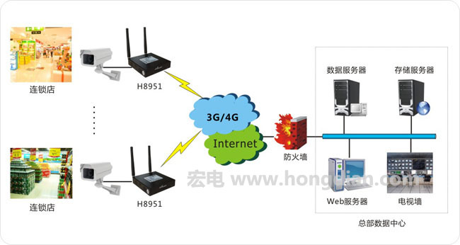 (1)中心端:申請3G運(yùn)營商專線,通過運(yùn)營商機(jī)房租用線路至用戶中心機(jī)房接入路由器,并制定相 關(guān)企業(yè)域名,開辦數(shù)據(jù)上網(wǎng)卡,并將卡綁定至企業(yè)域名中。