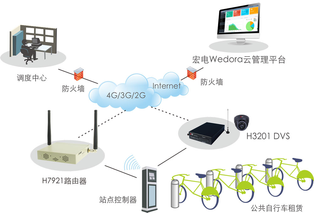 深圳宏電城市公共自行車租賃無(wú)線智能管理系統(tǒng)由站點(diǎn)管理設(shè)備、H7921 VPN路由器、H3201 3G DVS和后端管理平臺(tái)四部分組成。其中站點(diǎn)管理設(shè)備分布于公共自行車運(yùn)營(yíng)商的多個(gè)公共場(chǎng)所,如公交站點(diǎn)、地鐵口、寫字樓附近、大型商場(chǎng)附近等,用于租賃用戶信息記錄、刷卡取車、還車、站點(diǎn)圖片等業(yè)務(wù)。通過宏電H7921路由器和H3201 3G DVS將記錄的租車和抓拍的租車點(diǎn)圖片傳送到后端管理平臺(tái),從而實(shí)現(xiàn)對(duì)多站點(diǎn)自行車實(shí)現(xiàn)統(tǒng)一的租賃信息管理與統(tǒng)計(jì)、租賃計(jì)時(shí)計(jì)費(fèi)、站點(diǎn)環(huán)境與自行車使用狀態(tài)監(jiān)測(cè)等功能,從而幫助運(yùn)營(yíng)商及時(shí)掌握各站點(diǎn)自行車的租賃狀況,為后續(xù)的運(yùn)營(yíng)、管理和維護(hù)提供提供可靠的數(shù)據(jù)支撐,有效地提高公共自行車租賃的管理水平和運(yùn)營(yíng)商的經(jīng)營(yíng)效益。