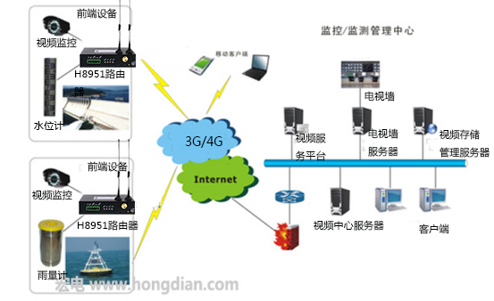 前端設(shè)備包括無(wú)線路由器H8951,攝像頭,水位傳感器和遙測(cè)終端機(jī)。 水位信息和視頻圖像以無(wú)線網(wǎng)絡(luò)發(fā)送;服務(wù)器提供數(shù)據(jù)中轉(zhuǎn),用戶權(quán)限管理等;客戶端提供用戶查看水位信息和實(shí)時(shí)視頻,并將這些信息通過(guò)H8951無(wú)線通信設(shè)備傳遞給后方,動(dòng)態(tài)數(shù)據(jù)在后臺(tái)數(shù)據(jù)庫(kù)整理后在指揮中心電視拼接墻顯示出來(lái),供決策人員進(jìn)行現(xiàn)場(chǎng)指揮和統(tǒng)籌兼顧。