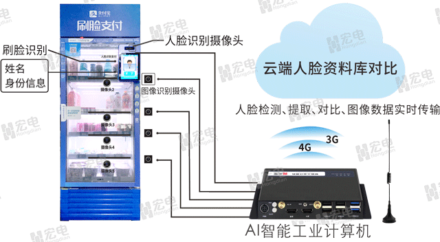 方案通過宏電H9380P AI智能工業(yè)計(jì)算機(jī)接入刷臉識別攝像頭,實(shí)現(xiàn)人臉圖像信息的實(shí)時(shí)采集處理、高清圖像數(shù)據(jù)提取上傳到云端人臉資料庫對比,實(shí)時(shí)反饋人臉數(shù)據(jù)處理信息,并控制AI售貨機(jī)門鎖開關(guān)、結(jié)算扣款