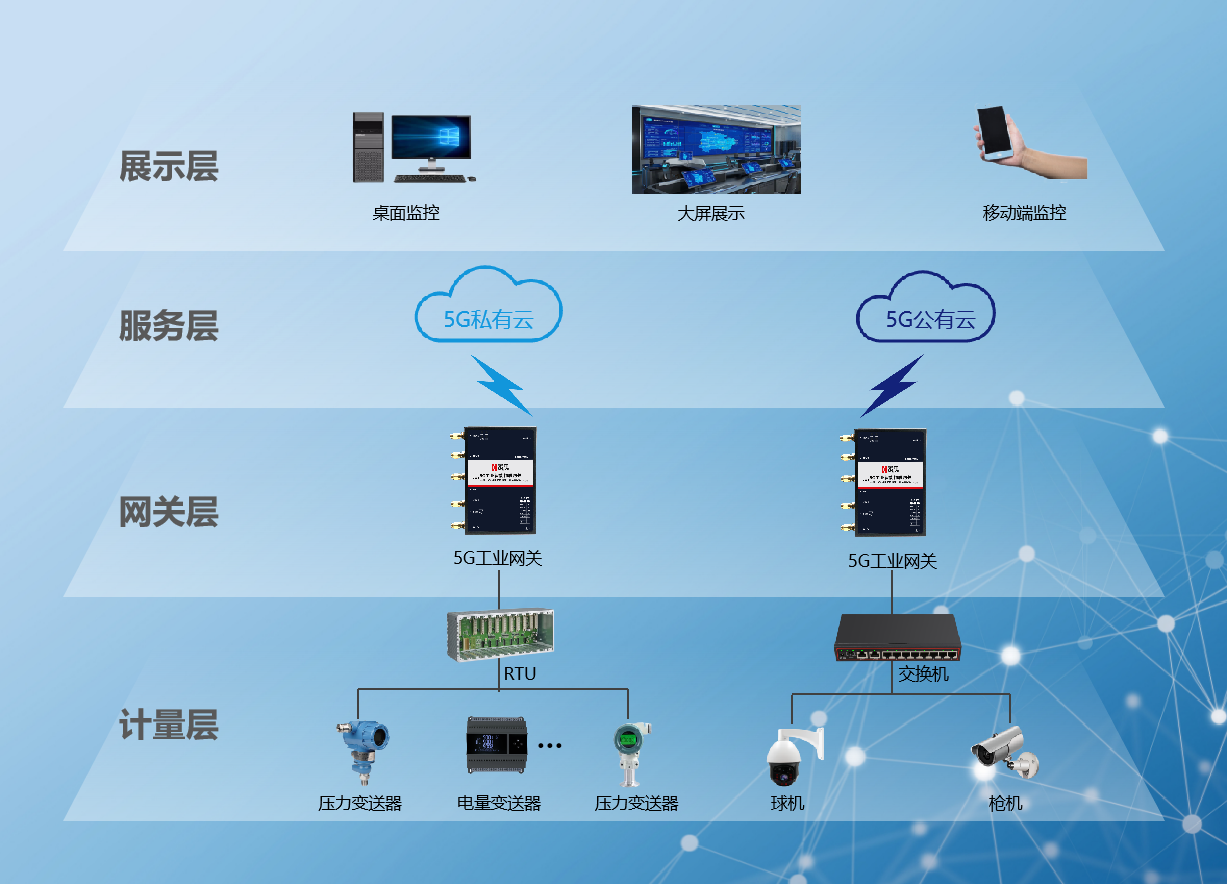 以5G組網(wǎng)方式通過宏電5G工業(yè)網(wǎng)關(guān)接入SCADA實時在線系統(tǒng),網(wǎng)關(guān)利用5G特性進行端到端低時延通訊,實現(xiàn)對壓力、流量、密閉空間、燃氣泄漏等傳感器數(shù)據(jù)實時監(jiān)測上傳,實現(xiàn)管網(wǎng)地理空間、運行狀態(tài)信息的集成以及管網(wǎng)運行狀態(tài)的動態(tài)安全監(jiān)管。