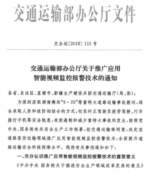 如何降低事故率,是政策層面一直在關(guān)注的問題。在2016年12月頒布的《中共中央國務(wù)院關(guān)于推進安全生產(chǎn)領(lǐng)域改革發(fā)展的意見》中,寫明生產(chǎn)安全事故責(zé)任入刑,以商用車作為重點監(jiān)管對象的交通安全成為三大重點領(lǐng)域之一。2017年4月《營運客車安全技術(shù)條件》正式實施,明文要求“車長大于9米的客車,應(yīng)裝備前撞預(yù)警系統(tǒng)(FCWS)及車道偏離預(yù)警系統(tǒng)(LDWS)”。2018年6月,交通運輸部辦公廳發(fā)布關(guān)于推廣應(yīng)用智能視頻監(jiān)控報警技術(shù)的通知,要求在既有三類以上班線客車、旅游包車、危險貨物道路運輸車輛、農(nóng)村客運車輛、重型營運貨車上安裝智能視頻監(jiān)控報警裝置,新進入道路運輸市場的“兩客一危”車輛前裝智能視頻監(jiān)控報警裝置,實現(xiàn)對駕駛員不安全駕駛行為的自動識別和實時報警。
