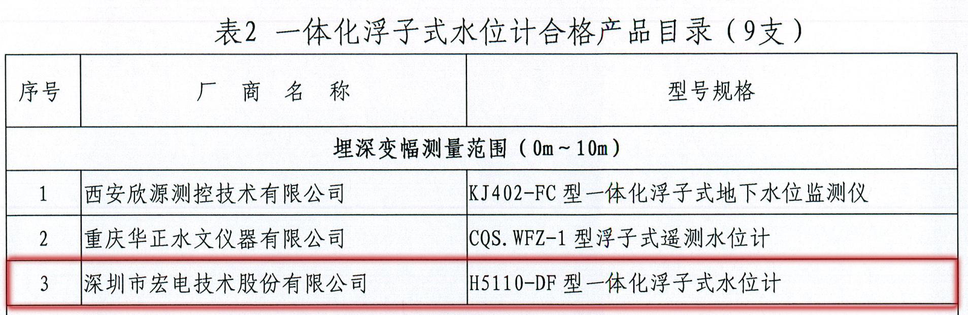 2015年5月,深圳市宏電技術股份有限公司的一體化壓力水位計(型號:H5110-DY)和一體化浮子式水位計(型號:H5110-DF)兩款類型的產(chǎn)品同時通過檢測,成為首批入圍水利部水文及巖土工程儀器質(zhì)量監(jiān)督檢測中心發(fā)布的《地下水位監(jiān)測儀器設備檢測合格產(chǎn)品目錄》。