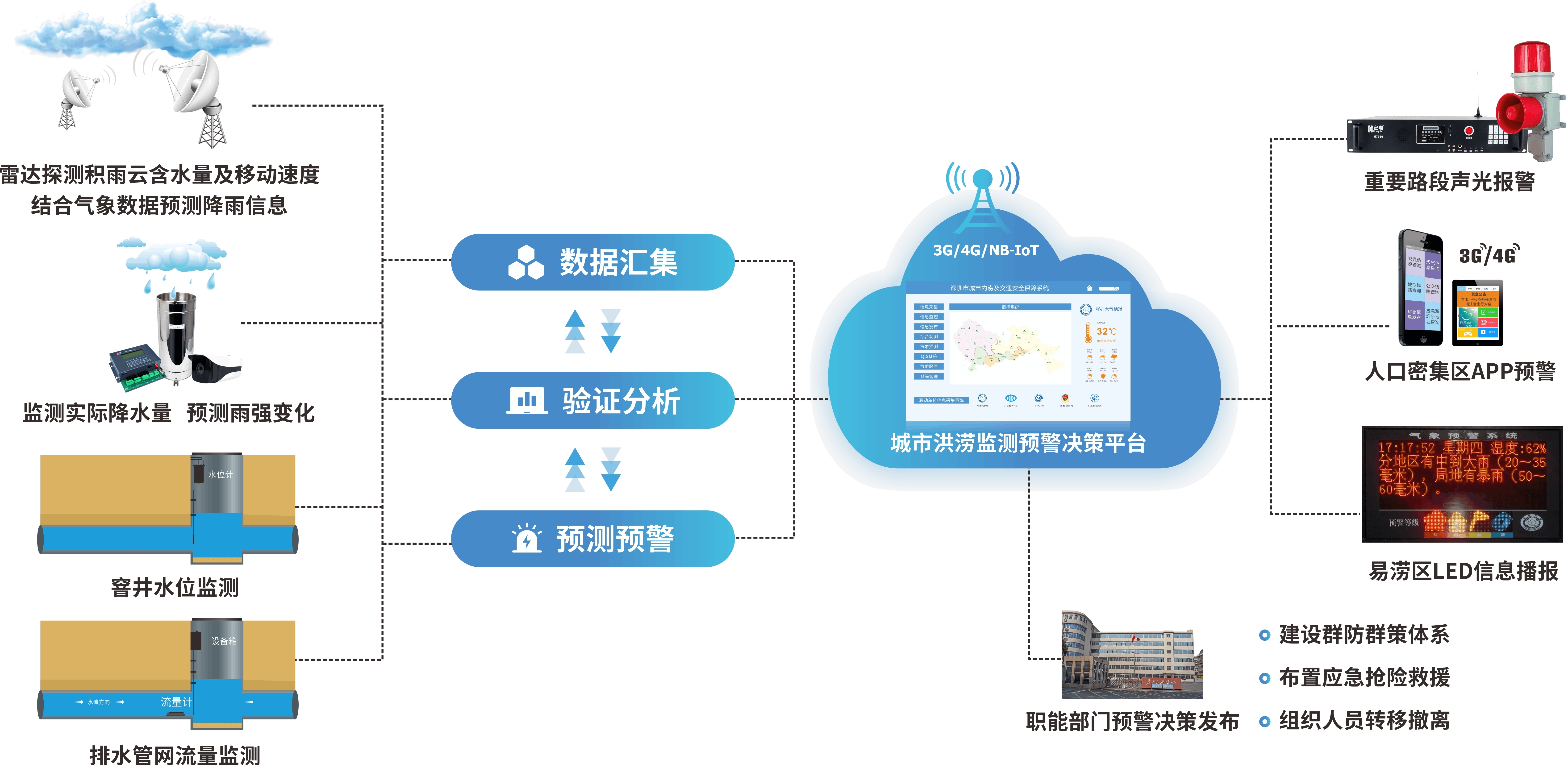 深圳宏電城市內(nèi)澇立體監(jiān)測與內(nèi)澇模擬系統(tǒng)由現(xiàn)場監(jiān)測站及監(jiān)控中心平臺軟件組成,現(xiàn)場監(jiān)測站由雨量傳感器、雷達水位計/氣泡水位計/壓力水位計、流速/流量傳感器、視頻監(jiān)控、聲光報警器、LED顯示屏、遙測終端機和電源系統(tǒng)組成。監(jiān)控中心軟件平臺可遠程監(jiān)測重點區(qū)域的空中降雨量、地面產(chǎn)流、排水管網(wǎng)匯流等實時數(shù)據(jù),基于DEM數(shù)據(jù)和管網(wǎng)分布信息,全面掌握排水管網(wǎng)的充滿度,對低洼地帶、地區(qū)及時做預警預測,有效支撐排水管網(wǎng)的日常運維工作和汛期排澇聯(lián)動。