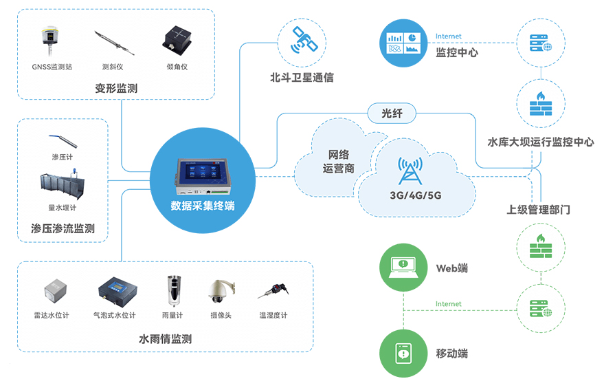 系統(tǒng)包含水庫雨水情監(jiān)測系統(tǒng)和大壩安全監(jiān)測自動化系統(tǒng)。水庫雨水情監(jiān)測系統(tǒng)以遙測終端為核心,配置翻斗式雨量計、雷達式或氣泡式水位計、電源系統(tǒng)、避雷系統(tǒng)以及相關(guān)的土建及附屬設(shè)施,實現(xiàn)雨水情信息的自動采集和自動傳輸。大壩安全監(jiān)測自動化系統(tǒng)可實現(xiàn)大壩表面變形監(jiān)測和滲流監(jiān)測。整個系統(tǒng)實現(xiàn)水庫大壩的全面感知監(jiān)測、綜合風(fēng)險評估、科學(xué)輔助決策、智能分析預(yù)警、常態(tài)巡檢及預(yù)案管理等主要功能,助力水庫智慧化監(jiān)管。