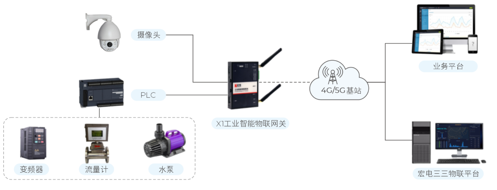 將宏電X1工業(yè)智能物聯(lián)網(wǎng)關(guān)與泵房現(xiàn)場PLC控制器、視頻監(jiān)控設(shè)備連接,多方位采集泵房設(shè)備的運行狀態(tài),將視頻圖像,水池水位,出站流量、壓力,泵站供應(yīng)電流、電壓,泵的開關(guān)狀態(tài)、工作電流、電壓、頻率等數(shù)據(jù)通過4G/5G無線方式上報到業(yè)務(wù)平臺,泵房管理人員可以在業(yè)務(wù)平臺或者內(nèi)部局域網(wǎng)隨時遠(yuǎn)程監(jiān)測站內(nèi)狀態(tài),確保供水系統(tǒng)的安全穩(wěn)定運行。