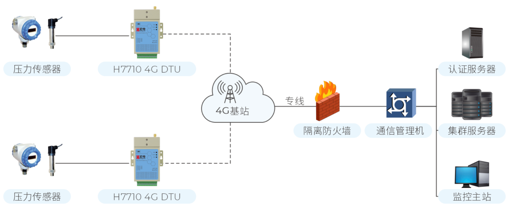 宏電H7710工業(yè)級4G DTU將供水管網(wǎng)的壓力數(shù)據(jù)實時上傳到監(jiān)控平臺,實時可視化監(jiān)測供水管網(wǎng)壓力變化情況,及時發(fā)現(xiàn)管網(wǎng)異常壓力變化,為管網(wǎng)安全運行提供保障。
