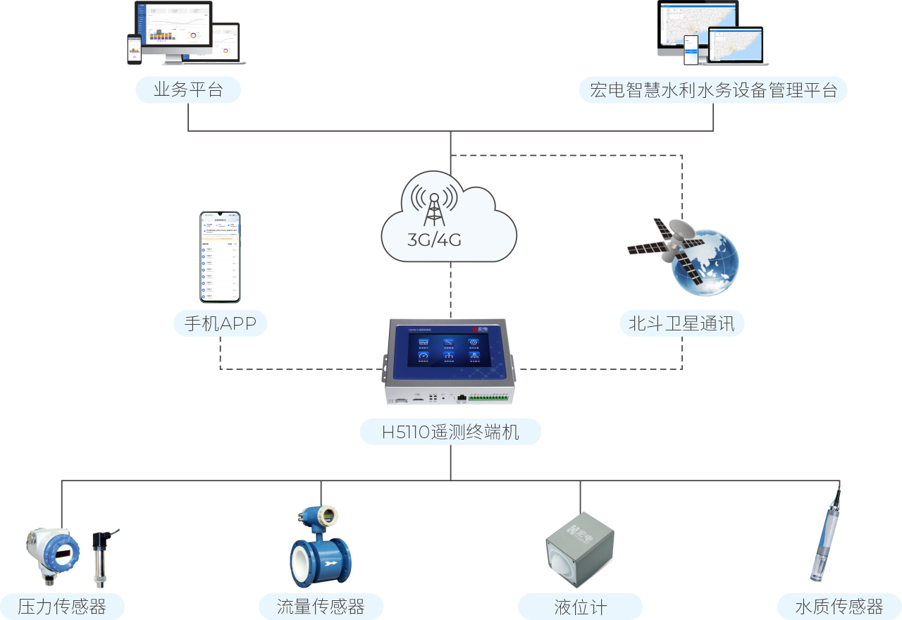 在城鄉(xiāng)供水通信網(wǎng)絡(luò)系統(tǒng)中采用宏電H5110遙測終端機,為水源、水廠、蓄水池、閥門、管網(wǎng)等監(jiān)測設(shè)施站點與各供水管理站之間提供傳感器數(shù)據(jù)采集、泵閥遠(yuǎn)程控制、數(shù)據(jù)上傳平臺和遠(yuǎn)程運維等功能。H5110遙測終端機可以向平臺提供數(shù)據(jù),也可以感知和控制傳感器設(shè)備;由平臺下發(fā)指令控制閥門的開合,同時感知壓力計、流量計的數(shù)據(jù)情況,適配宏電智慧水利水務(wù)設(shè)備管理平臺,可便捷地配置供水設(shè)備,實現(xiàn)供水場景一體化的監(jiān)測管理。