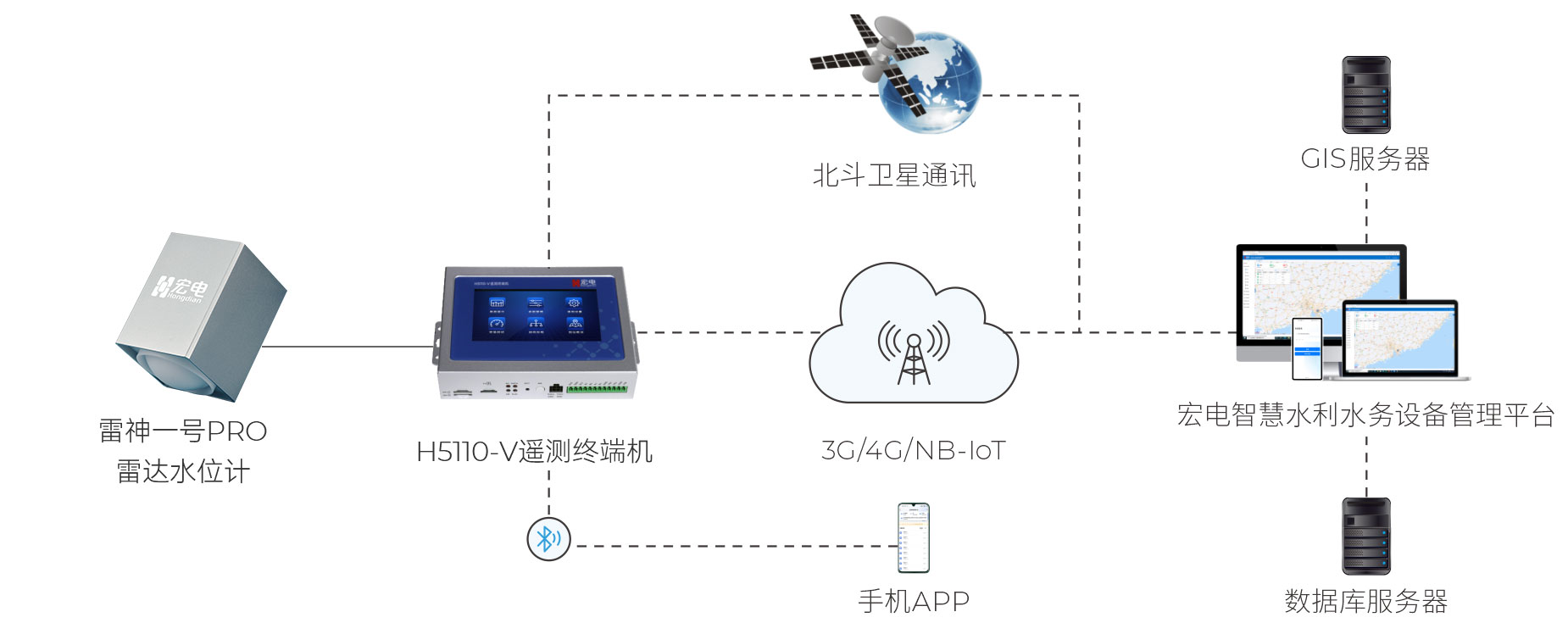 在監(jiān)測點布設(shè)水位監(jiān)測站,監(jiān)測站由“雷神一號Pro”雷達(dá)水位計、H5110-V遙測終端機、太陽能供電系統(tǒng)組成。由太陽能供電系統(tǒng)為水位監(jiān)測站提供電源,“雷神一號Pro”雷達(dá)水位計測量監(jiān)測點的水位數(shù)據(jù),H5110-V遙測終端機將數(shù)據(jù)通過無線網(wǎng)絡(luò)傳輸至宏電智慧水利水務(wù)設(shè)備管理平臺,實現(xiàn)無人值守在線監(jiān)測。