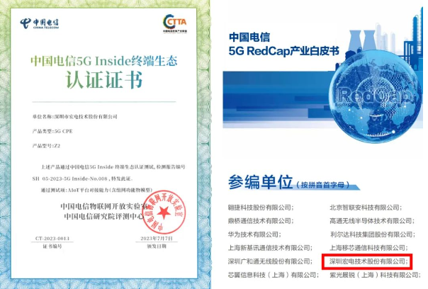 In February this year, in order to promote industrial cooperation, gather the industry ecology, and form a richer 5G industry terminal system as the goal, China Telecom released the 5G Inside cooperation plan, and jointly released the "China Telecom 5G RedCap Industry White Paper" and "China Telecom 5G Dual-domain Fast Network Business White Paper" with the industrial chain partners. As an important member of the alliance, Hongdian has long focused on the IoT wireless communication and industry application market, deeply combined with the needs of industry customers, empowered customers to digital transformation, and actively explored and commercialized 5G innovation in many industries such as industry, power, transportation, and energy. The two products of Hongdian 5G Industrial intelligent Gateway and 5G CPE have also passed strict terminal performance tests and won the 5G Inside terminal ecological certification issued by China Telecom. The reliability, stability and practicality of Hongdian 5G industrial communication terminals have been certified by industry authorities.
