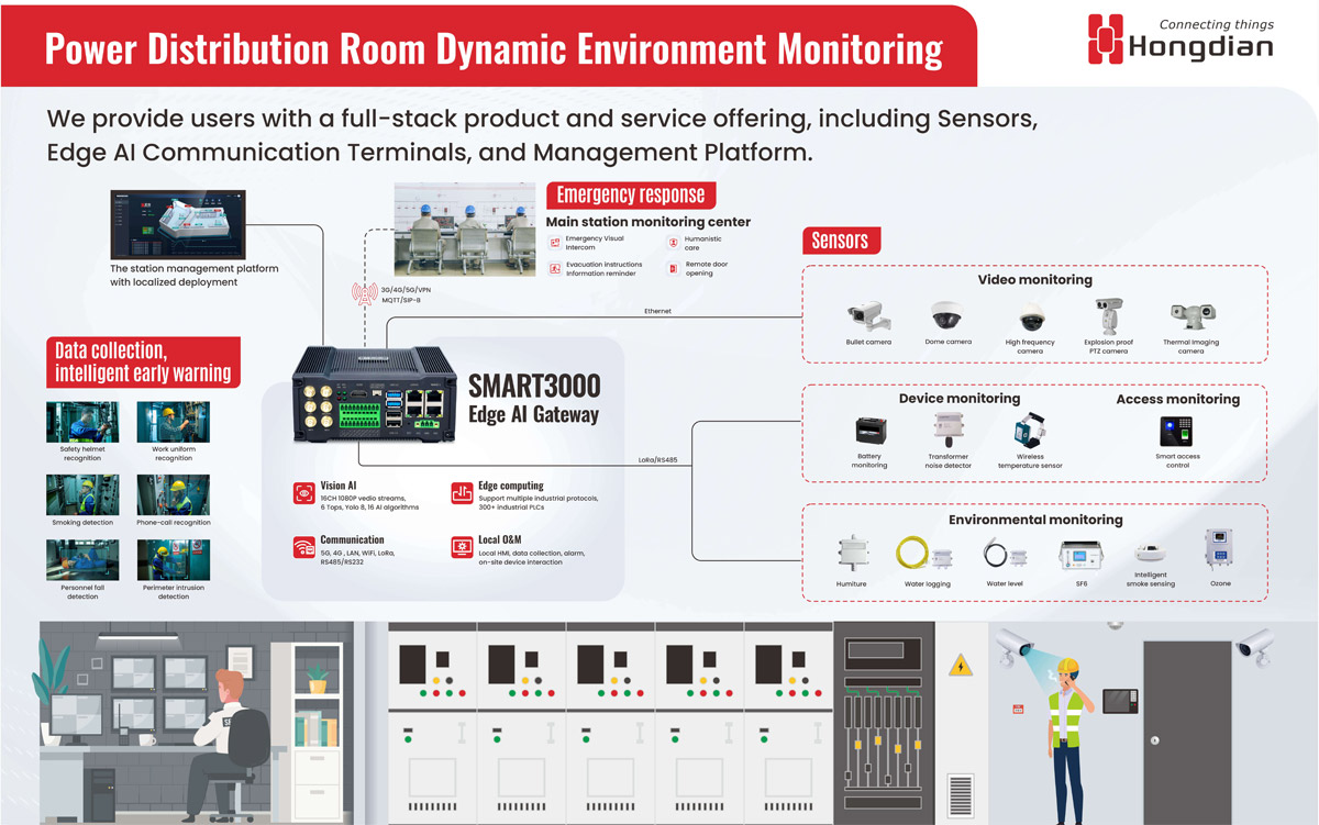 Hongdian’s smart distribution room monitoring solution integrates 5G, AI, and IoT technologies. By deploying the 5G Edge AI Gateway, the system aggregates data from temperature/humidity sensors, smoke detectors, water leakage sensors, and CCTV cameras. The Smart Distribution Room Management System visualizes operational data through 2.5D topology, charts, and reports, allowing operators to monitor substation status in real time.