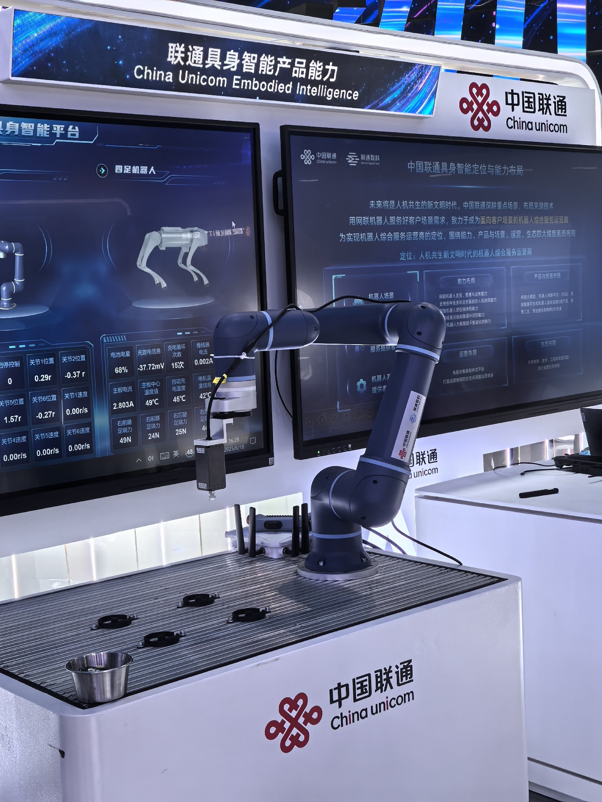 The 2025 MWC Shanghai was held at Shanghai New International Expo Centre from June 18 to 20, attracting global attention in the communications industry. Throughout the event, China Unicom showcased its "Gewu Embodied Intelligence Platform" featuring a live-connected six-axis robotic arm, with real-time operational metrics displayed across platform screens.