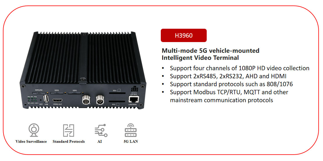 Hongdian multi-mode 5G vehicle-mounted intelligent video terminal is a product that integrates integrated gateway and vehicle-mounted video functions. It realizes real-time acquisition and transmission of multi-channel HD video through multi-mode 5G load balancing and bandwidth binding, and supports DSM camera and fatigue driving analysis. The product can also be combined with the Macro iScan vehicle networking platform to provide users with an overall turnkey vehicle solution. Support 2Tops or higher computing power to implement other businesses of AI edge computing. Based on the standard design of vehicle gauge level, it is widely used in the vehicle-mounted field of medical ambulance, rescue vehicle, sanitation vehicle, mining card and other special industries. It can also be applied to the logistics shuttle, logistics trucks in smart industrial parks, the unmanned vehicle inspection and other unmanned fields with the combination of computing force customization or AI box.