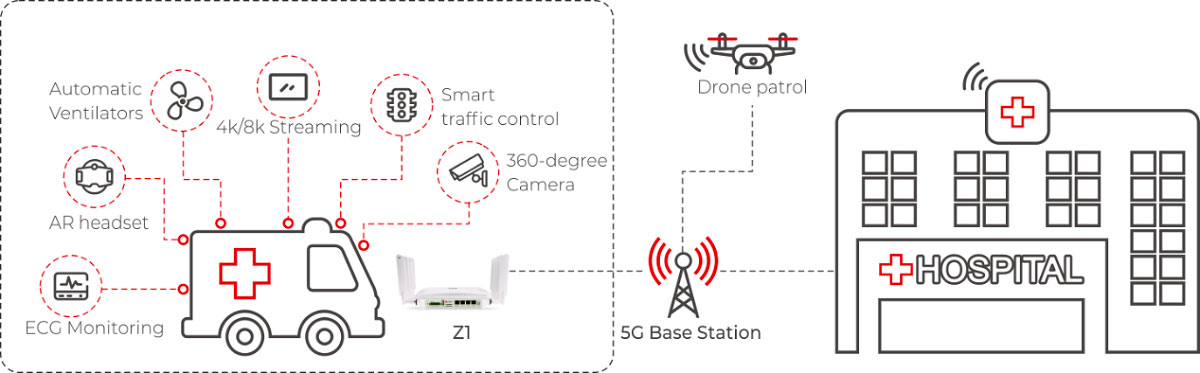 The ambulance is equipped with Hongdian Z1 5G CPE, which uploads the vehicle-mounted individual equipment, video surveillance equipment, medical equipment and other data to the hospital through Z1, and the hospital judges the current state of the patient through the return data, and prepares targeted treatment plans in advance. Utilizing the high-bandwidth access provided by Z1, various medical devices can be quickly connected to wireless networking, mobile deployment, medical diagnosis results, images, electronic medical records and other data are transmitted to the platform and APP in real time, realizing medical data sharing and easy implementation remote mobile consultation, auxiliary analysis, and coordinated treatment to improve the ability and operating efficiency of the emergency system.