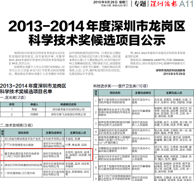 據(jù)深圳僑報最新消息:深圳市龍崗區(qū)科技創(chuàng)新局公布入選“2013-2014年度深圳市龍崗區(qū)科學技術(shù)獎”候選項目名單,并在深圳僑報上面向社會各界予以公示,深圳宏電榮膺技術(shù)發(fā)明獎。