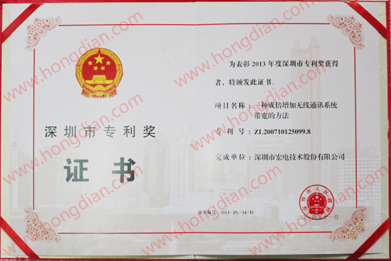 在全市科學技術(shù)大會上,宏電股份憑借無線通信基礎(chǔ)技術(shù)上的核心改進發(fā)明技術(shù)——“一種成倍增加無線通訊系統(tǒng)帶寬的方法”攬獲“深圳市專利獎”這一獎項,再次證明了宏電公司在無線通信領(lǐng)域的技術(shù)實力與創(chuàng)新能力。