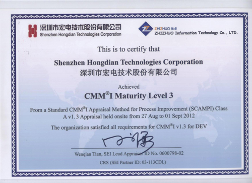 2012年9月1日,經(jīng)過評審小組嚴格的審核和評估,SEI授權(quán)評估師隆重的宣布,深圳市宏電技術(shù)股份有限公司通過CMMI-ML3復(fù)審和重新認證。