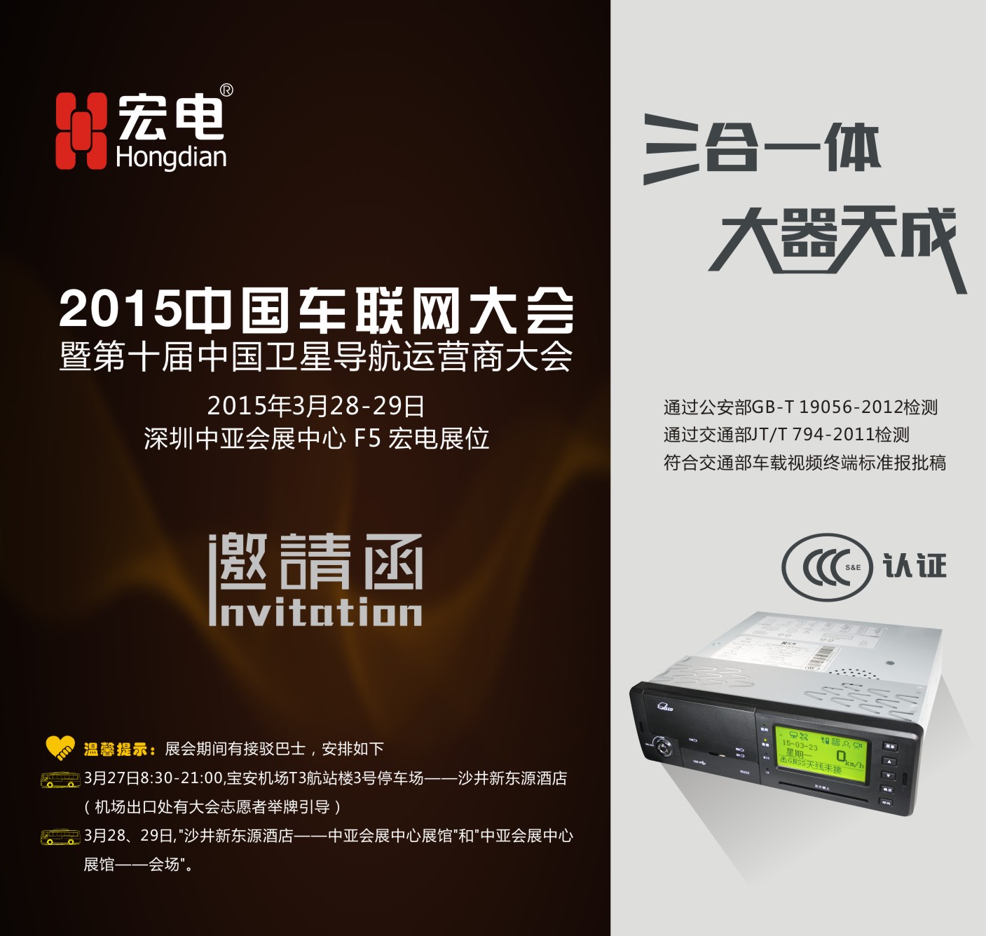 一年一度的國內(nèi)車聯(lián)網(wǎng)行業(yè)盛會(huì)即將于2015年3月38-29日在深圳·中亞會(huì)展中心盛大開幕。深圳市宏電技術(shù)股份有限公司將攜旗下車聯(lián)網(wǎng)全線新品及行業(yè)解決方案亮相F5號展位。