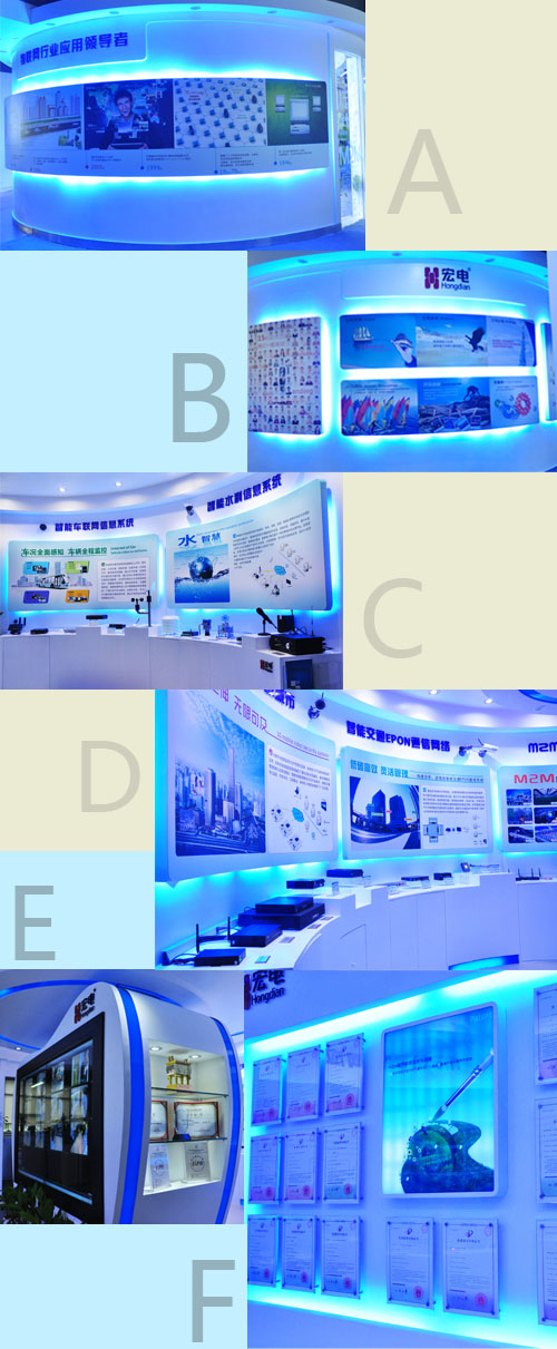 面向公司正門的外弧墻體(A區(qū))迎面展現(xiàn)著一副述說以M2M與物聯(lián)網(wǎng)掀起第三次信息技術(shù)革命的發(fā)展故事,一張張精心設(shè)計的圖片能夠讓參觀者在最短時間了解我國物聯(lián)網(wǎng)發(fā)展之路,迅速解答物聯(lián)網(wǎng)是什么,未來物聯(lián)網(wǎng)能夠做什么,M2M與物聯(lián)網(wǎng)的關(guān)系等多個疑問。與之對稱的另一面外弧墻體(B區(qū))以多塊展板圖片相互映襯,展示著宏電“創(chuàng)造智慧生活”遠(yuǎn)大愿景和企業(yè)經(jīng)營理念。展廳內(nèi)部空間更是做了精細(xì)的布置,相對著的兩面內(nèi)弧墻體(C區(qū)和D區(qū))劃分為5個小版塊,分別展示宏電在智能車聯(lián)網(wǎng)信息系統(tǒng)、智能水利信息系統(tǒng)、無線視頻及平安城市、智能交通EPON通信網(wǎng)絡(luò)、M2M及物聯(lián)網(wǎng)應(yīng)用五大重點行業(yè)的覆蓋傳感層、傳輸層、應(yīng)用層的成套硬件產(chǎn)品、軟件平臺和整體解決方案。在這里,展示著以無線傳輸和行業(yè)應(yīng)用為核心優(yōu)勢的40余款產(chǎn)品,包括3G車載硬盤錄像機(jī)、無線廣播預(yù)警終端、電力級DTU、金融版3G路由器以及智能交通EPON產(chǎn)品設(shè)備等多款拳頭級產(chǎn)品。同時水雨情信息平臺系統(tǒng)、山洪災(zāi)害廣播預(yù)警系統(tǒng)、3G車載視頻監(jiān)控系統(tǒng)、車載信息管理系統(tǒng)、M2M終端設(shè)備管理系統(tǒng)等多款平臺軟件,更是彰顯了宏電十余年嵌入式系統(tǒng)和應(yīng)用軟件開發(fā)的強(qiáng)勁科研實力。