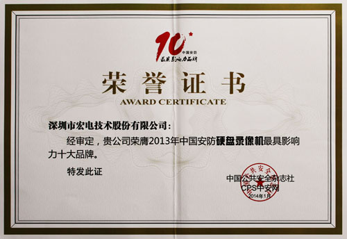 深圳市宏電技術股份有限公司受邀參加了此次行業(yè)盛宴,憑借2013年在車載視頻監(jiān)控領域的突出貢獻,在來自公安部、安防行業(yè)協(xié)會及全國知名安防企業(yè)的上千名安防行業(yè)精英的共同見證下,宏電獲得“2013年中國安防硬盤錄像機類最具影響力十大品牌” 的權威殊榮。