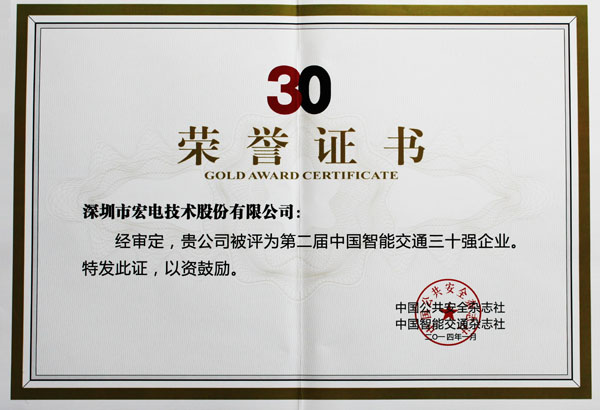2014年1月8日,“2014智能交通行業(yè)協(xié)會(huì)全體大會(huì)暨2014新春團(tuán)拜會(huì)”在深圳綠景錦江酒店隆重舉行,會(huì)議邀請(qǐng)到公安部、智能交通協(xié)會(huì)的領(lǐng)航、行業(yè)專家和智能交通領(lǐng)域優(yōu)秀企業(yè)代表共兩百余人參加。在會(huì)議同期舉行的“2013第二屆中國(guó)智能交通三十強(qiáng)企業(yè)”頒獎(jiǎng)典禮上,深圳市宏電股份有限公司(以下簡(jiǎn)稱“宏電”)憑借在智能交通車載監(jiān)控與車輛安全管理領(lǐng)域的良好品牌形象和企業(yè)實(shí)力斬獲此項(xiàng)行業(yè)殊榮,獲得中國(guó)智能交通三十強(qiáng)企業(yè)稱號(hào)。