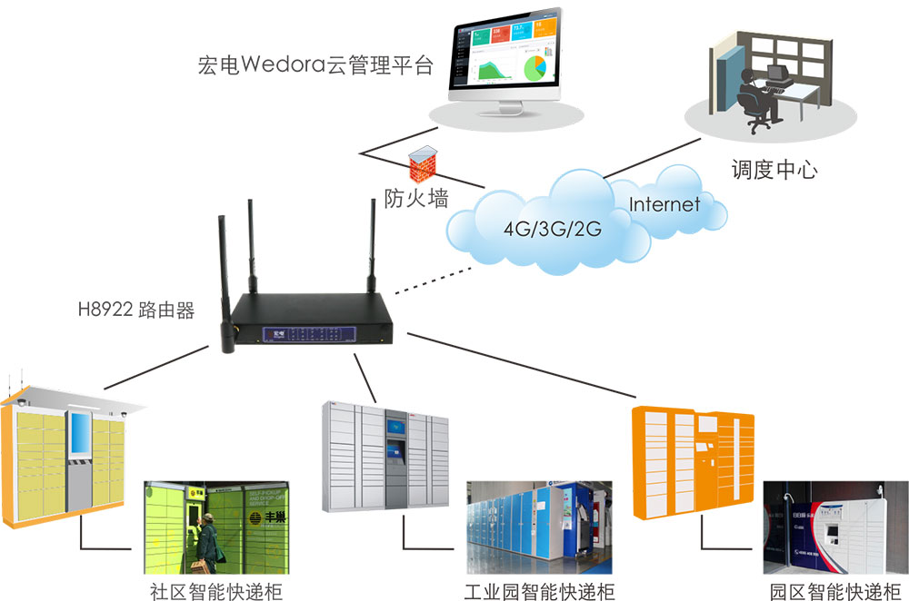 本項(xiàng)目中宏電無線解決方案的核心設(shè)備是為自助快遞柜與企業(yè)業(yè)務(wù)平臺(tái)建立無線鏈路傳輸通道的H8922 3G/4G無線路由器,該產(chǎn)品是一款基于3G/4G無線網(wǎng)絡(luò)通訊的工業(yè)級(jí)通信產(chǎn)品,集成了全系列從邏輯鏈路層到應(yīng)用層通信協(xié)議,能夠?yàn)橛脩籼峁┌踩⒏咚佟⒎€(wěn)定、可靠的各種協(xié)議路由轉(zhuǎn)發(fā)的無線路由網(wǎng)絡(luò),并且支持功能強(qiáng)大的宏電M2M云管理平臺(tái),能夠?qū)崿F(xiàn)自助快遞柜終端3G/4G無線聯(lián)網(wǎng)和遠(yuǎn)程管理服務(wù)。