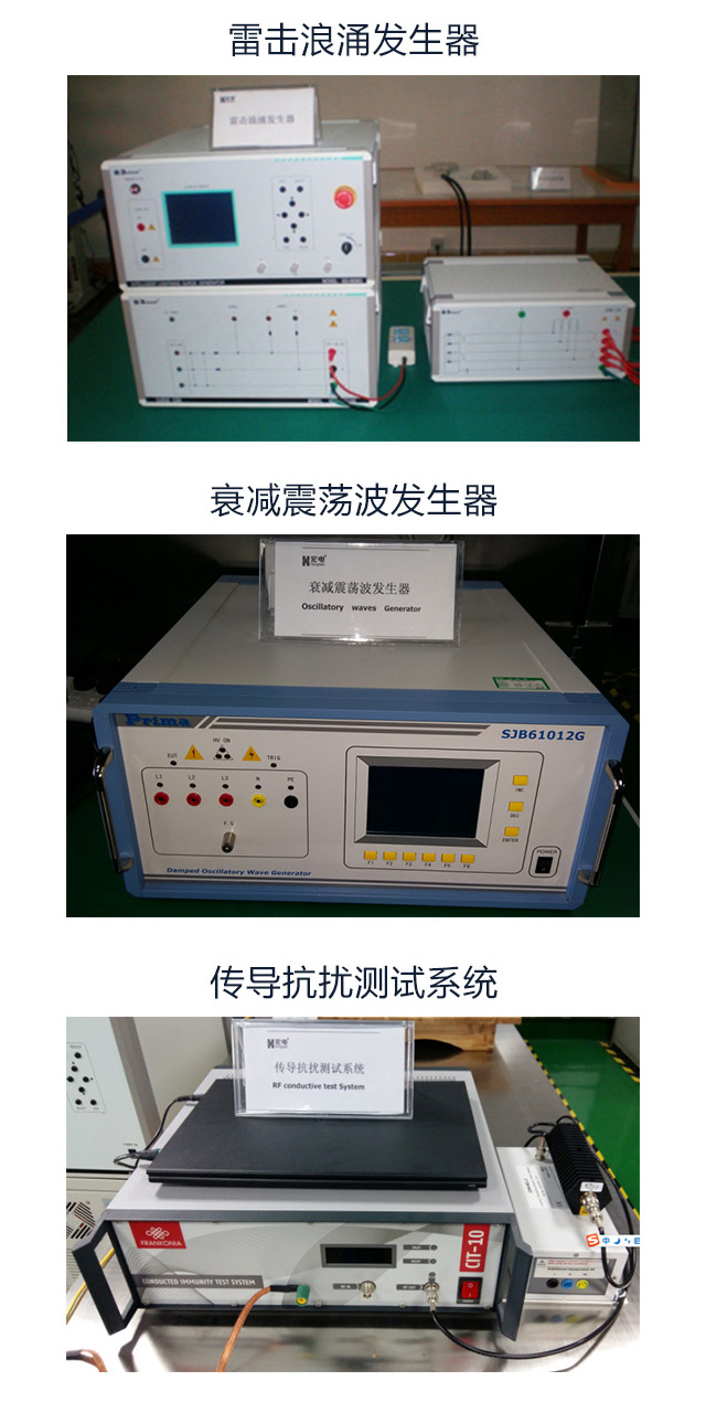 在高性能屏蔽房內(nèi),通過靜電放電發(fā)生器、雷擊浪涌發(fā)生器、電壓中斷/跌落發(fā)生器、電快速脈沖群發(fā)生器、衰減震蕩波發(fā)生器、傳導(dǎo)抗擾測試系統(tǒng)、汽車電子抗擾系統(tǒng),對設(shè)備產(chǎn)品進行全方位的EMC測試。