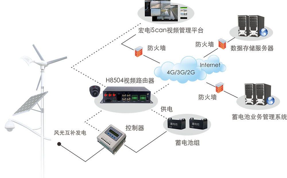 風(fēng)光互補(bǔ)監(jiān)控系統(tǒng)由風(fēng)力發(fā)電機(jī)、太陽(yáng)能電池板、攝像頭、宏電視頻路由器VTU H8504、控制器、蓄電池組、宏電視頻云管理平臺(tái)組成,通過(guò)宏電視頻路由器將森林場(chǎng)景監(jiān)控畫面通過(guò)4G高速網(wǎng)絡(luò)實(shí)時(shí)傳輸?shù)椒阑鸨O(jiān)控中心以及宏電視頻云管理平臺(tái),實(shí)現(xiàn)防火人員在室內(nèi)對(duì)野外的遠(yuǎn)距離集中監(jiān)控。