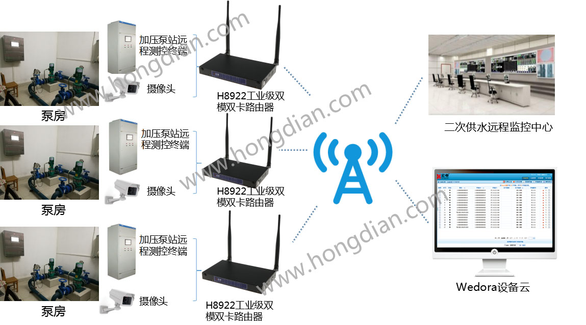 宏電作為M2M行業(yè)先行者,一直積極探索產(chǎn)業(yè)+物聯(lián)網(wǎng)的深度融合,在推動(dòng)城市信息化、數(shù)字化升級的過程中積累豐富的實(shí)踐經(jīng)驗(yàn),本項(xiàng)目提出建設(shè)一套集監(jiān)控、管理、分析與一體的數(shù)據(jù)采集與傳輸遠(yuǎn)控系統(tǒng),對此提供基于4G無線通信的二次供水遠(yuǎn)程監(jiān)控系統(tǒng),該系統(tǒng)前端將泵站測控終端、攝像頭連接宏電H8922工業(yè)級雙模雙卡路由器,后端接入二次供水遠(yuǎn)程監(jiān)控平臺(tái)、宏電Wedora設(shè)備云。