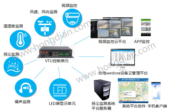 傳統(tǒng)的定點(diǎn)環(huán)境監(jiān)測(cè)方式,具有一定的局限性和片面性,不能做環(huán)境整體監(jiān)控,在環(huán)境監(jiān)測(cè)、應(yīng)急、監(jiān)察執(zhí)法過程中,經(jīng)常受到地形、環(huán)境、交通等不利因素限制。宏電污染源在線監(jiān)測(cè)可視化系統(tǒng)通過多方位的前端布局,實(shí)現(xiàn)對(duì)污染源的實(shí)時(shí)、準(zhǔn)確的信息采集,構(gòu)建全天候、立體化、多層次的智慧環(huán)保感知系統(tǒng),使得感知監(jiān)控更透徹,資源整合更,智能應(yīng)用更深入。以揚(yáng)塵在線監(jiān)測(cè)為例,通過前端設(shè)備用一臺(tái)宏電VTU 4G視頻路由器H8504,這款集“監(jiān)控+傳輸”一體化終端,取代過去需要分別部署的監(jiān)控設(shè)備和傳輸設(shè)備,實(shí)現(xiàn)采集端設(shè)備(溫度傳感器、揚(yáng)塵監(jiān)測(cè)傳感器、風(fēng)速傳感器)和攝像頭的多外設(shè)接入,實(shí)現(xiàn)采集溫度、揚(yáng)塵、噪聲等數(shù)據(jù)和圖像數(shù)據(jù)的實(shí)時(shí)傳輸,避免減少監(jiān)控中心的重復(fù)建設(shè)。