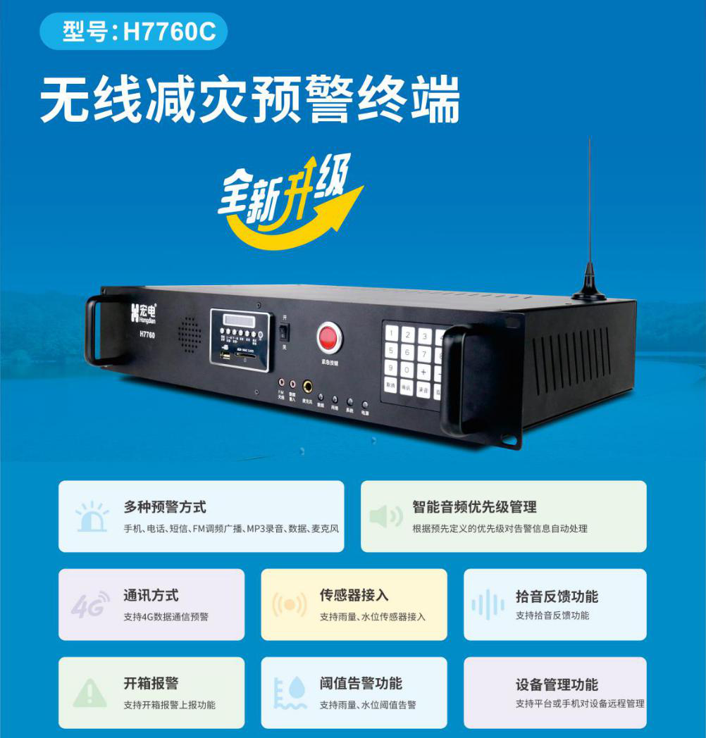 宏電全新升級(jí)的H7760C無(wú)線減災(zāi)預(yù)警終端,為客戶提供完整可靠的減災(zāi)預(yù)警解決方案,能夠大幅度提高預(yù)警信息的傳遞速度。產(chǎn)品經(jīng)過(guò)嚴(yán)格測(cè)試,符合工業(yè)級(jí)設(shè)計(jì)標(biāo)準(zhǔn),具有超強(qiáng)的可靠性。該設(shè)備主要為水利、氣象、地質(zhì)等各行業(yè)用戶提供預(yù)警電話廣播、信息語(yǔ)音播報(bào)、本地廣播通報(bào)的服務(wù)。