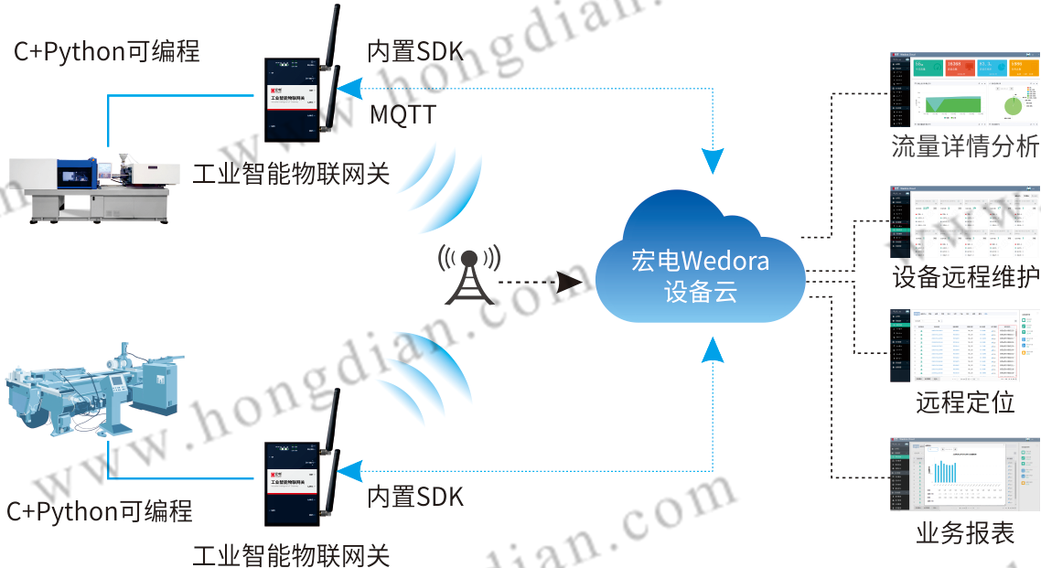 經(jīng)過多次與數(shù)控機床廠家的交流,宏電認(rèn)為首先需要解決設(shè)備聯(lián)網(wǎng)的網(wǎng)絡(luò)通道和網(wǎng)絡(luò)接入的問題,根據(jù)數(shù)控機床設(shè)備在全國、全球的點多分散及使用現(xiàn)場的環(huán)境,對數(shù)控機床CNC控制單元和測量數(shù)據(jù)單元的遠(yuǎn)程診斷維護及數(shù)據(jù)監(jiān)測,通過無線通信隨時通信、易部署特點,以邊緣計算網(wǎng)關(guān)—宏電工業(yè)智能物聯(lián)網(wǎng)關(guān)為載體建立機床設(shè)備之間互聯(lián)互通的通道,建立數(shù)控機床遠(yuǎn)程智能監(jiān)控系統(tǒng),具體方案實施主要從以下幾個方面: