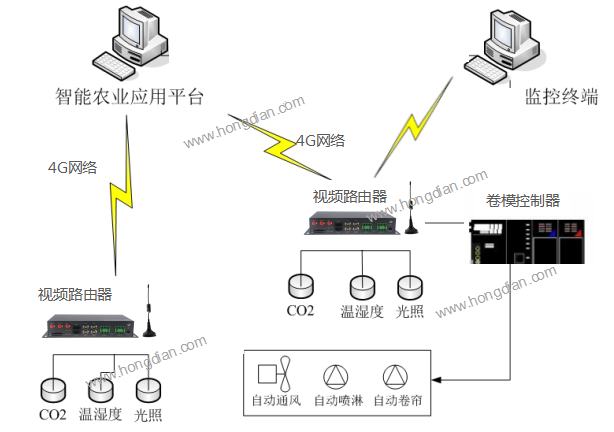 數(shù)字化農(nóng)業(yè)大棚物聯(lián)網(wǎng)方案主要由智能農(nóng)業(yè)遠(yuǎn)程信息采集和控制系統(tǒng)、遠(yuǎn)程控制系統(tǒng)、物聯(lián)網(wǎng)無線通信終端、智能農(nóng)業(yè)管理平臺組成,通過物聯(lián)網(wǎng)的傳感器技術(shù)采集溫室內(nèi)溫度、濕度、光照、土壤溫度、土壤濕度、CO2濃度、視頻等環(huán)境參數(shù),通過物聯(lián)網(wǎng)無線通信設(shè)備H8504視頻路由器傳輸?shù)娇刂浦行暮椭悄苻r(nóng)業(yè)應(yīng)用平臺。實現(xiàn)大棚農(nóng)作物生長情況的實時監(jiān)控和環(huán)境調(diào)節(jié),大棚設(shè)備的遠(yuǎn)程控制智能管理。