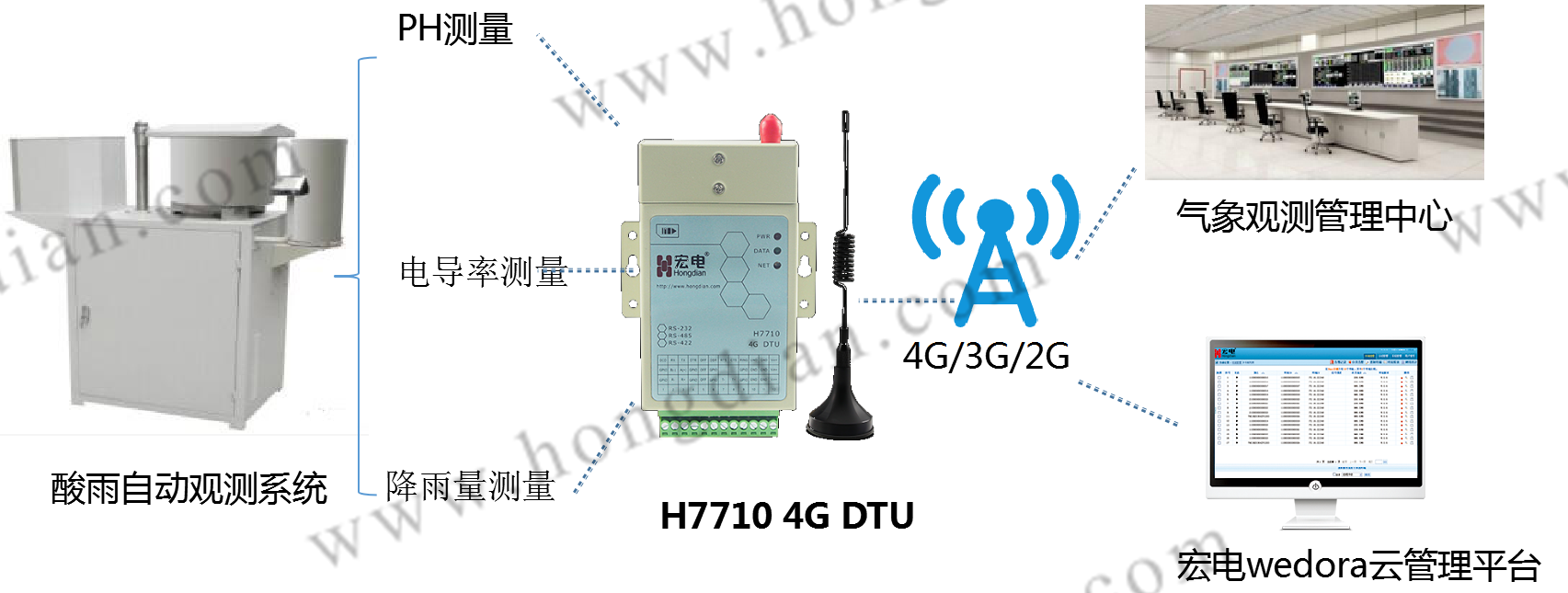 該方案主要由宏電H7710 4G DTU、酸雨自動(dòng)觀測系統(tǒng)、氣象監(jiān)測中心組成,H7710 DTU RS-232接口接入酸雨自動(dòng)觀測系統(tǒng),通過DTU 4G高速無線網(wǎng)絡(luò)把酸雨自動(dòng)觀測系統(tǒng)采集到的降水PH值、電導(dǎo)率、降水樣溫度、降水量數(shù)據(jù)數(shù)據(jù)上傳到氣象觀測中心,氣象觀測人員通過采集到的觀測數(shù)據(jù)和信息,進(jìn)行質(zhì)量檢驗(yàn)和整合,形成完整的酸雨觀測數(shù)據(jù)記錄。