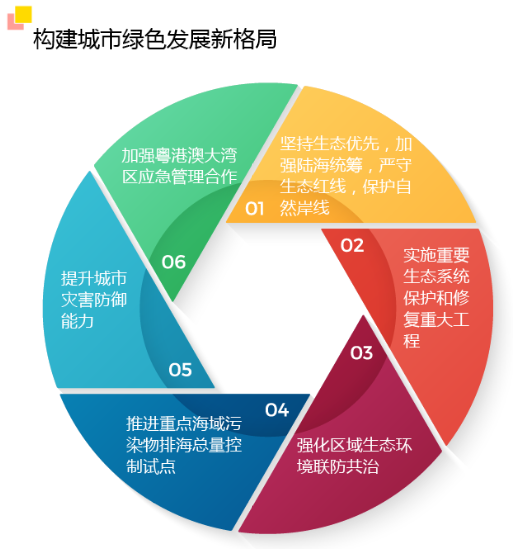 針對率先打造人與自然和諧共生的美麗中國典范,意見指出,構建城市綠色發展新格局。堅持生態優先,加強陸海統籌,嚴守生態紅線,保護自然岸線。實施重要生態系統保護和修復重大工程,強化區域生態環境聯防共治,推進重點海域污染物排海總量控制試點。提升城市災害防御能力,加強粵港澳大灣區應急管理合作。加快建立綠色低碳循環發展的經濟體系,構建以市場為導向的綠色技術創新體系,大力發展綠色產業,促進綠色消費,發展綠色金融。繼續實施能源消耗總量和強度雙控行動,率先建成節水型城市。