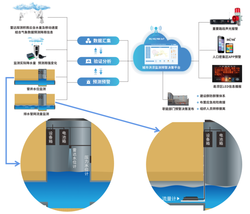 近年來(lái),由于強(qiáng)降水或連續(xù)性降水超過城市排水管網(wǎng)的排水能力,致使城市產(chǎn)生內(nèi)澇積水災(zāi)害頻發(fā)。為了及時(shí)準(zhǔn)確地掌握城市給排水管網(wǎng)的運(yùn)行特征,需要對(duì)其液位、流速及流量等多種基本運(yùn)行參數(shù)進(jìn)行測(cè)量,獲取連續(xù)的液位、流速及流量數(shù)據(jù),掌握其變化規(guī)律;通過這些基礎(chǔ)數(shù)據(jù)的瞬時(shí)分析、統(tǒng)計(jì)計(jì)算、模型模擬等,可以全面地進(jìn)行系統(tǒng)現(xiàn)狀診斷與評(píng)估,為各項(xiàng)研究工作的開展奠定堅(jiān)實(shí)的數(shù)據(jù)基礎(chǔ)。城市排水管網(wǎng)智能監(jiān)測(cè)解決方案,可以實(shí)現(xiàn)對(duì)城市排水管網(wǎng)中的地下水流量、水位實(shí)時(shí)監(jiān)測(cè),并利用監(jiān)測(cè)數(shù)據(jù)輔助排水管網(wǎng)的管理與維護(hù)。
