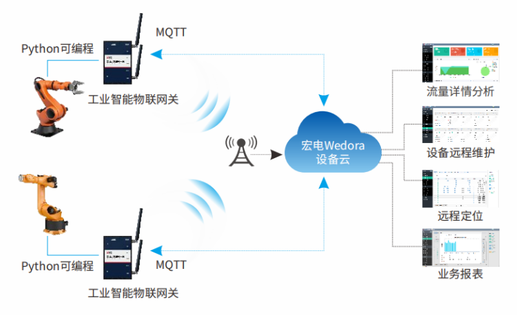 這對(duì)于并沒有如此多維護(hù)人員的機(jī)器人制造商來說非常困難。同時(shí),由于設(shè)備是租賃的,也需要對(duì)機(jī)器人的位置進(jìn)行實(shí)時(shí)的監(jiān)控管理。針對(duì)客戶的痛點(diǎn),我們提供了一套遠(yuǎn)程智能裝備運(yùn)維解決方案,首先是通過配套宏電網(wǎng)關(guān)完成對(duì)機(jī)器人私有協(xié)議的對(duì)接并上傳到客戶的云端平臺(tái),實(shí)時(shí)了解機(jī)器人的工作狀態(tài);同時(shí),通過宏電的工業(yè)互聯(lián)網(wǎng)平臺(tái),通過sdlan,虛擬串口,VPN等技術(shù),能夠?qū)崿F(xiàn)對(duì)機(jī)器人的遠(yuǎn)程控制。最后,通過宏電網(wǎng)關(guān)收集到的基站小區(qū)信息,實(shí)現(xiàn)室內(nèi)基站定位,完成了資產(chǎn)管理功能。