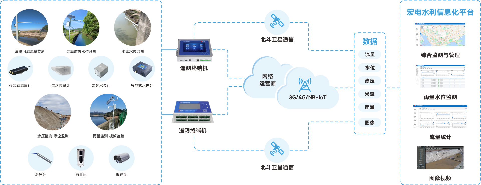 系統(tǒng)主要由信息采集、數(shù)據(jù)傳輸、智慧水利平臺(tái)等部分組成。各類(lèi)監(jiān)測(cè)站點(diǎn)采集水體的水位/流量、雨量、視頻等數(shù)據(jù),通過(guò)RTU傳輸?shù)?a href="/cn/water/proview_100000132016194.html" target="_blank">智慧水利平臺(tái)。智慧水利平臺(tái)是宏電基于物聯(lián)網(wǎng)技術(shù)和行業(yè)特點(diǎn)打造的綜合性平臺(tái),內(nèi)嵌豐富的算法模型。從水利信息化監(jiān)測(cè)管理業(yè)務(wù)出發(fā),融合傳感器、采集傳輸、GIS平臺(tái)、信息匯集、信息處理、圖像視頻、預(yù)警預(yù)報(bào)、調(diào)度管理等技術(shù),實(shí)現(xiàn)數(shù)據(jù)感知、遠(yuǎn)程監(jiān)測(cè)、預(yù)警預(yù)報(bào)、輔助決策等功能。