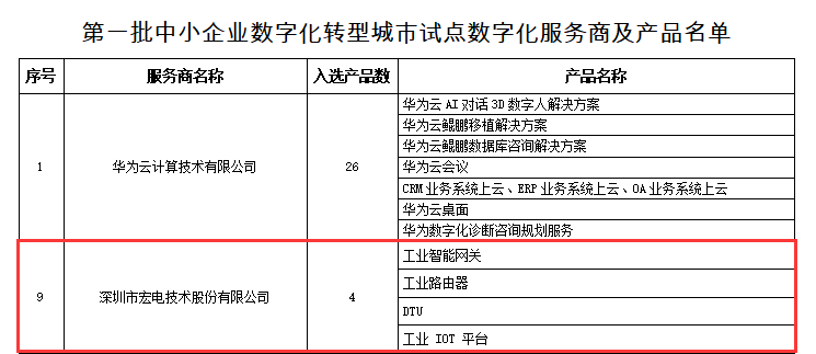 2024年4月,深圳市中小企業(yè)服務局公布了第一批中小企業(yè)數(shù)字化轉型城市試點數(shù)字化服務商及產品名單,本次遴選出43家數(shù)字化服務商,深圳市宏電技術股份有限公司入選服務商名單。