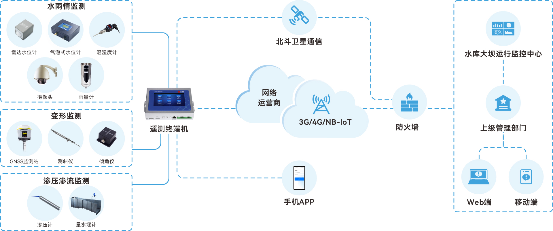 系統(tǒng)包含水庫(kù)雨水情監(jiān)測(cè)系統(tǒng)和大壩安全監(jiān)測(cè)自動(dòng)化系統(tǒng)。水庫(kù)雨水情監(jiān)測(cè)系統(tǒng)以遙測(cè)終端為核心,配置翻斗式雨量計(jì)、雷達(dá)式或氣泡式水位計(jì)、攝像頭、電源系統(tǒng)、避雷系統(tǒng)以及相關(guān)的土建及附屬設(shè)施,實(shí)現(xiàn)雨水情信息的自動(dòng)采集和自動(dòng)傳輸。大壩安全監(jiān)測(cè)自動(dòng)化系統(tǒng)可實(shí)現(xiàn)大壩表面變形監(jiān)測(cè)和滲流監(jiān)測(cè)。整個(gè)系統(tǒng)實(shí)現(xiàn)水庫(kù)大壩的全面感知監(jiān)測(cè)、綜合風(fēng)險(xiǎn)評(píng)估、科學(xué)輔助決策、智能分析預(yù)警、常態(tài)巡檢及預(yù)案管理等主要功能,助力水庫(kù)智慧化監(jiān)管。